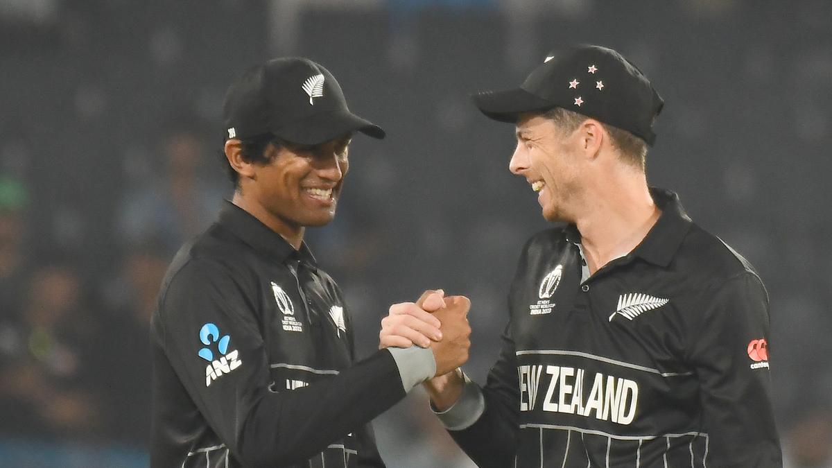 New Zealand’s Rachin Ravindra (left) together with his teammate Mitchell Santner in the course of the ongoing ODI World Cup.